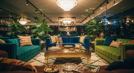 A chic modern living room featuring stylish furniture, warm lighting, and greenery. This inviting space blends comfort and elegance, perfect for relaxation.