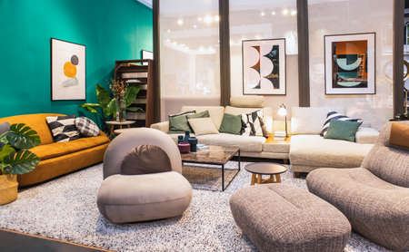 Vilnius, Lithuania - May 26, 2019: Interior view of living room inside IKEA Store. IKEA is Swedish-founded, worlds largest furniture retailer