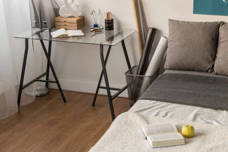 Bedroom corner with glass desk top and metal trestles with personal items on top and a large bed in grey beside