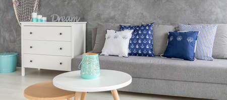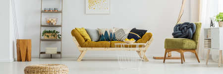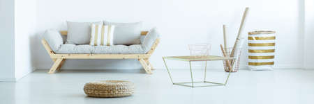 Panorama of pouf and gold table in white living room interior with grey wooden sofa. Real photo