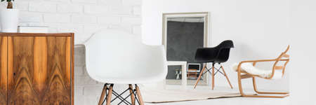 Get some rest here. View of white chairs standing near the sofa under the wall