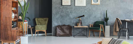 Grey flat with wood bookcase, armchair and stylish accessories, panorama