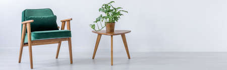 Vintage yellow armchair standing next to a wooden table with plant on it in bright waiting room