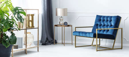 Navy blue armchair next to gold table with lamp and clock in sophisticated living room interior