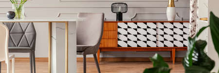 Real photo of wooden retro cupboard with pattern with lamp standing in bright dining room interior with grey chairs and marble table