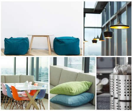 The contemporary interior of the living room with sofa, pillows, tables, sofas, and lamps