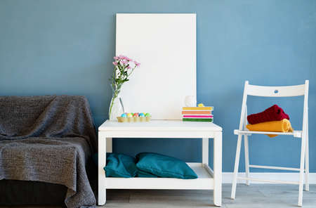 Mock up white poster frame on coffee table in blue room. White blank canvas in interior