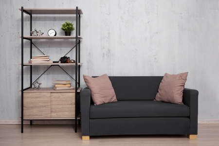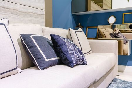 fabric sofa with pillows and lanterns in Interior of modern guestroom in studio apartments