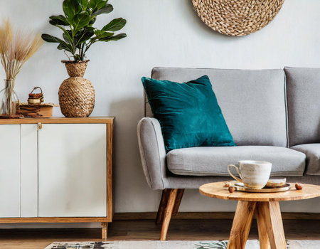 Living room interiors with natural lighting, minimalist furniture and boho decor. Residential interior design composition in calming tones.