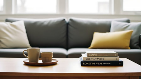 A cozy living room scene featuring a vase with dried flowers, a coffee cup on a stack of books, and soft sunlight streaming through blinds
