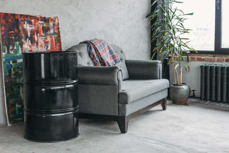Modern eco loft interior in living room, concrete floor, sofa, minimalism studio