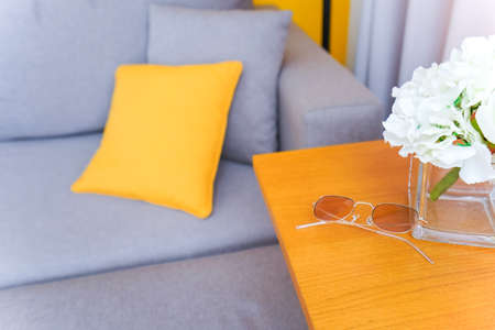 Cup on a wooden coffee table and blurry background with graphic pillows on a gray sofa in a white living room interior