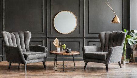 Classic black modern interior empty room with lounge armchairs, table and mirrors.