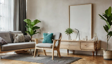 Chic Scandinavian living room composition showcasing a cozy design armchair, minimalist black mock-up poster, and natural wood furniture, all styled with muted tones and Nordic-inspired