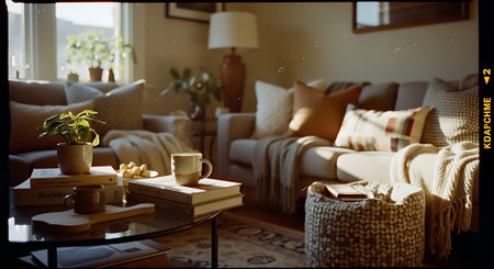 A warm, inviting living room with a coffee table featuring books, a camera, mugs, and plants. Comfortable seating and natural light create a relaxing atmosphere.