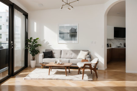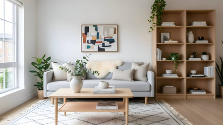 Modern living room designed with natural light, minimalist furniture, and greenery in a spacious home setting
