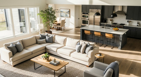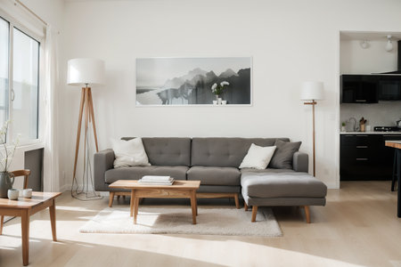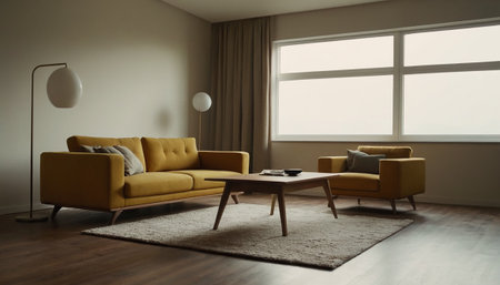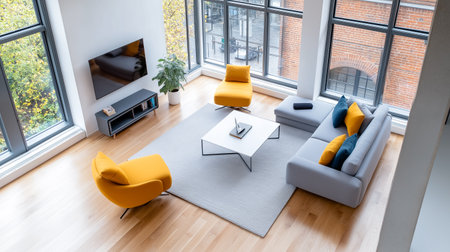 Brightly lit open area highlights modern furniture with a cozy arrangement, including a gray sofa, vibrant yellow chairs, and a sleek coffee table, creating a comfortable atmosphere. Generated AI
