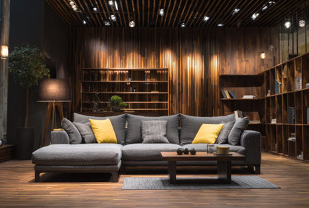 This interior photograph features a contemporary living room arrangement. A gray sectional sofa is centered, complemented by yellow pillows. The room showcases wooden wall panels and a textured ceiling. Soft lighting creates a warm ambiance. Suitable for illustrating interior design, home decor, or lifestyle themes for commercial applications.