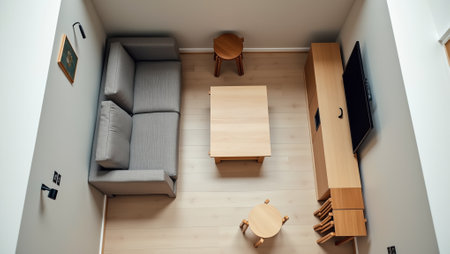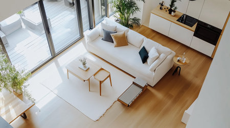 Serene Pastel Living Room: Modern Cozy Interior Design Aerial View