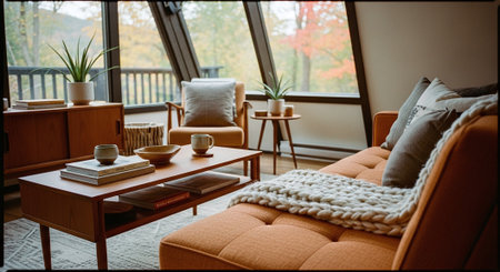 A stylish mid-century modern living room featuring orange and green decor, large windows with a view of autumn trees, and contemporary furniture