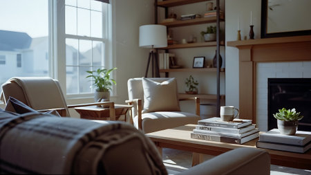 A warm, inviting living room with a coffee table featuring a mug, glasses, books, and a plant. A comfortable sofa with pillows and a cozy blanket is visible.