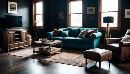 A sophisticated interior with a teal sofa, wooden furniture, and decor illuminated by natural light from the windows.. AI Generation
