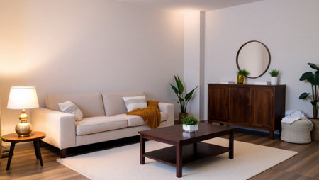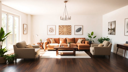 Concept illustration of a modern living room with a picture frame on the wall. Generative AI
