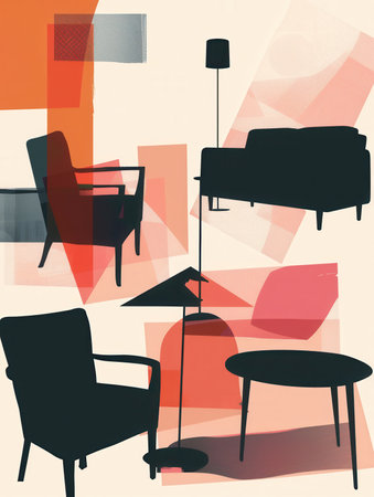 Various silhouettes of furniture, including an armchair, table, and lamp, create a stylish composition against a light backdrop.