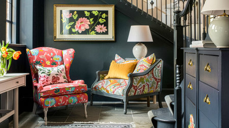 Elegant vintage living room with floral sofa and wallpaper. That the image is generated using AI.