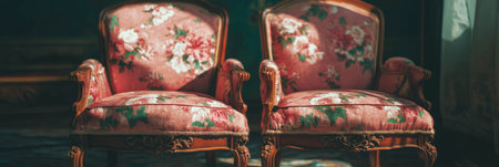 Elegant wooden chairs with intricate carvings and floral upholstery in a stylish setting