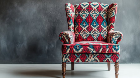 A vibrant vintage armchair featuring a colorful patterned upholstery stands against a textured gray wall, adding a unique, artistic touch to modern interior spaces.