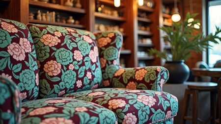 Floral pattern sofa in cozy rustic coffee shop with wooden shelves. That the image is generated using AI.