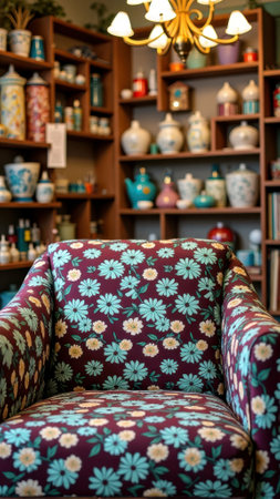 Floral armchair in vintage store with decorated porcelain jars and wooden shelves. That the image is generated using AI.