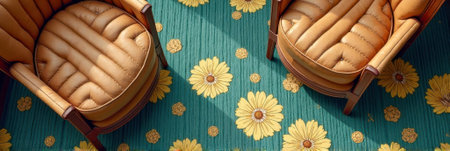 Retro style armchairs on floral carpet with yellow flowers and green background. That the image is generated using AI.