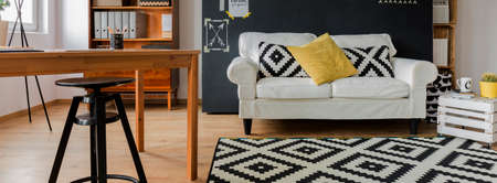 Cozy minimalist flat with wooden desk, sofa, pattern carpet and pillows, DIY coffee table and blackboard, panorama