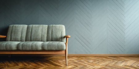 A modern living room showcases a grey sofa with wooden arms set against a textured wall. The warm wooden floor adds a cozy touch to the stylish space.
