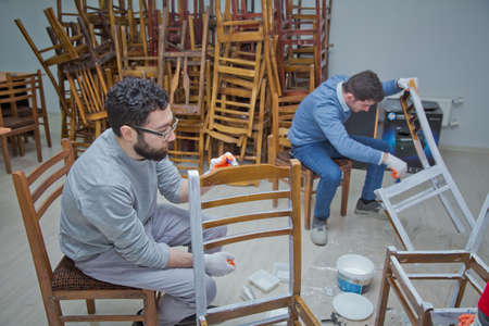 Azerbaijan Baku . 17.05.2020 . Two people. Old chairs are painted white . Painting Old Furniture . Baby chairs are painted. Upcycling concept.