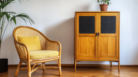 A golden wooden cabinet with black doors stands against the white wall, and next to it is an armchair in a light yellow color. The interior of a minimalist style features natural lighting and shadows, creating a cozy atmosphere. A plant or vase can be placed on top of the sideboard for decor. This is a wide-angle shot with low contrast, high-resolution photography, hyper-realistic, cinematic, and professional color grading. --chaos 30 --ar 16:9 --v 6.1 Job ID: 56037a48-5496-4806-91c4-ed4c94c6c4de