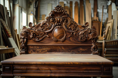 Ornate wooden headboard with detailed carvings displayed in a workshop, emphasizing traditional craftsmanship and the beauty of furniture design