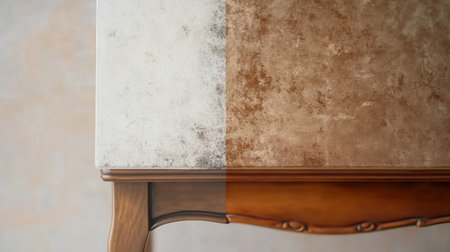 One side shows a dusty furniture surface while the other reveals a clean, shiny surface demonstrating effective cleaning techniques.