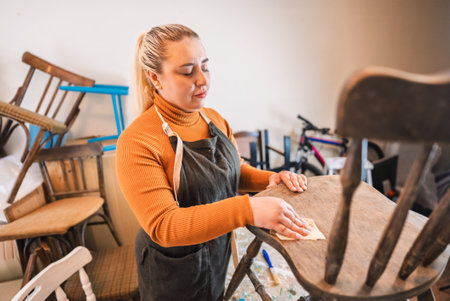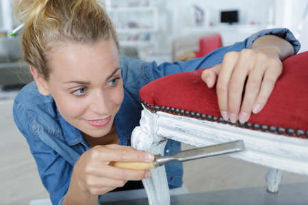 Young woman in workshop restoring old furniture by upholstering armchair replacing fabric to give fresh look focusing on craftsmanship and detail in refurbishment process. Copy space
