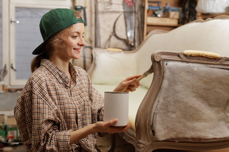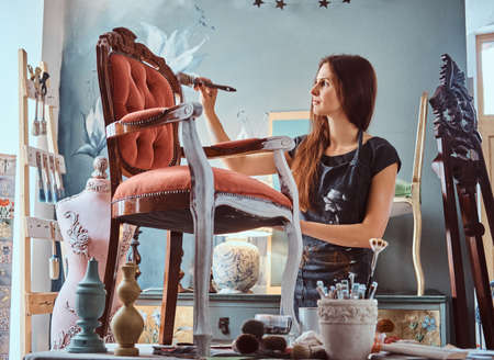 Female artist painting vintage chair in white color with paintbrush in workshop.