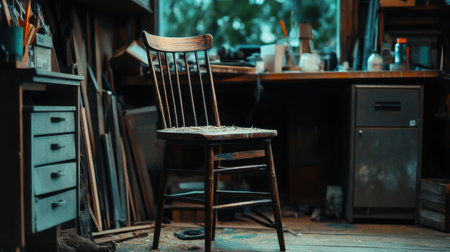 A rustic wooden chair sits alone in a workshop filled with various crafting tools, capturing the essence of craftsmanship and creativity in a cozy environment.