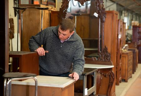 Interested buyer choosing wooden furniture for apartment in furnishing salon