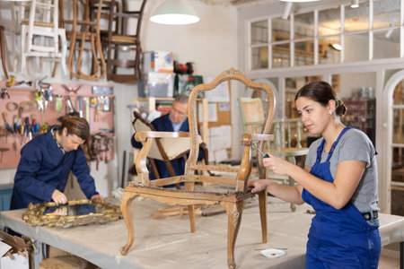 Skilled female furniture repair specialist in uniform restoring Victorian chair during workday in workshop