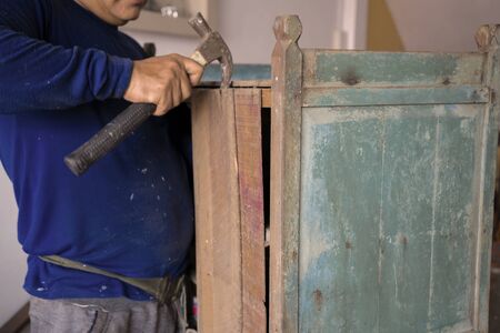 Woman in process of fixing old box made of wood with hammer in workshop for renovation. Giving old things new life. Reuse of aged. Sustainable actions for helping planet