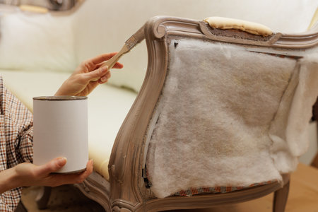 Close-up of hands painting a vintage armchair with beige paint during furniture restoration at home.