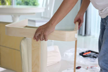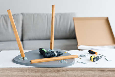 Drill, tool and another equipment on wood table, assembly furniture, improvement or repairing home interior and ideas. Electric screwdriver, chair and parts in living room with boxes, copy space