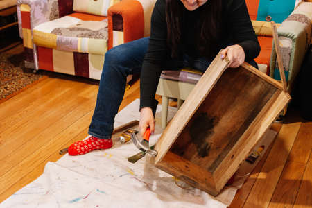 Portrait of skillful repair woman carpenter renovating dresser furniture using tools in woodwork studio