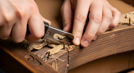 A close-up shot of a person's hands using a staple remover or tack puller to extract an old, rusty staple from the wooden frame of a piece of furniture. The old upholstery fabric is torn. This image represents furniture reupholstery, restoration, DIY, and manual labor.